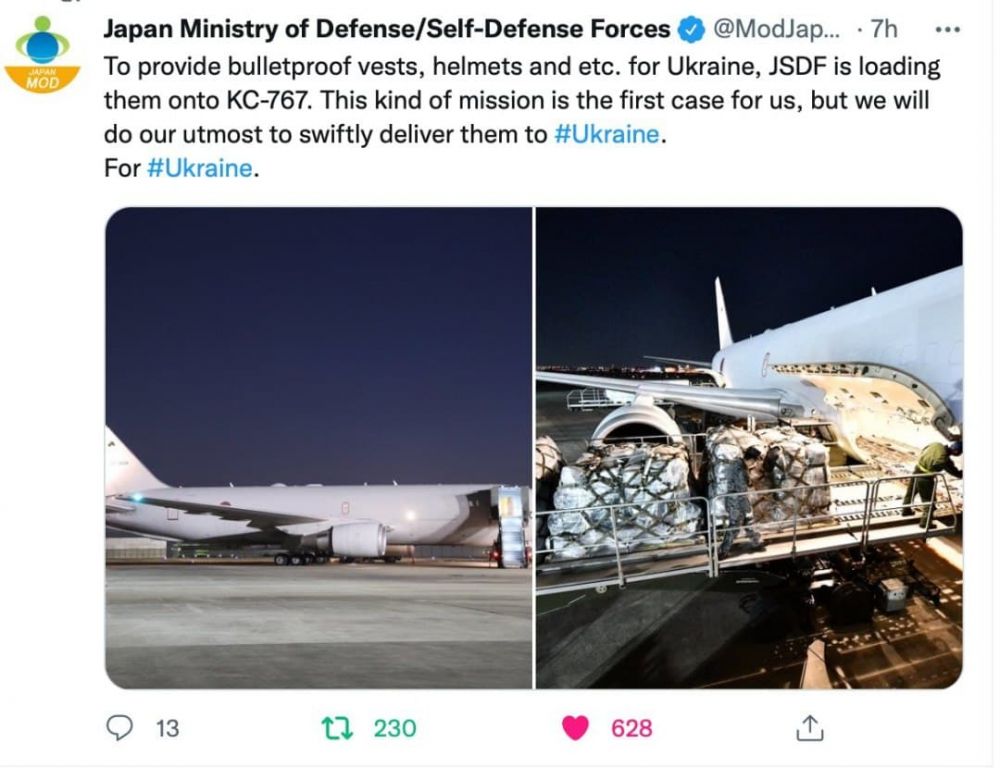 “Аби доправити до України бронежилети та шоломи, літак КС-767 вилетів із повітряної бази Комакі. Міноборони та Сили самооборони продовжать докладати усіх зусиль, аби допомогти Україні”, - йдеться у повідомленні міністерства оборони Японії.