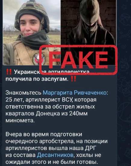 Телеграм-канали поширюють інформацію, що нібито взяли у полон артилеристку ЗСУ Маргариту Рівчаченко з позивним «Сакура», яка обстрілювала житлові квартали Донецька з міномета, за що була покарана. До тексту додається фото, яке ймовірно мало б свідчити, що Маргарита знаходиться у полоні. Але це фейк.