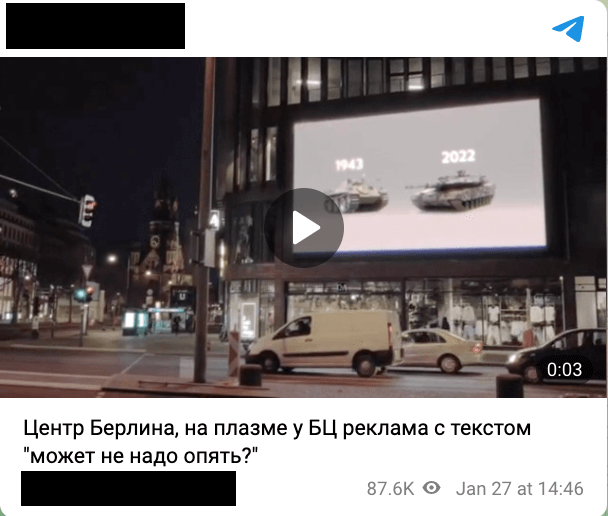 У соцмережах публікують відео, яке нібито зроблене у Берліні. У записаному матеріалі можна помітити рекламний екран, розміщений на стіні будівлі, що транслює відео із закликом не надавати танки Україні. У рекламі нібито використали зображення танків 1943 та 2022 років з підписом «може ніколи знову?». Мовляв, таким чином німці нагадують уряду про події Другої світової війни. Але це неправда.