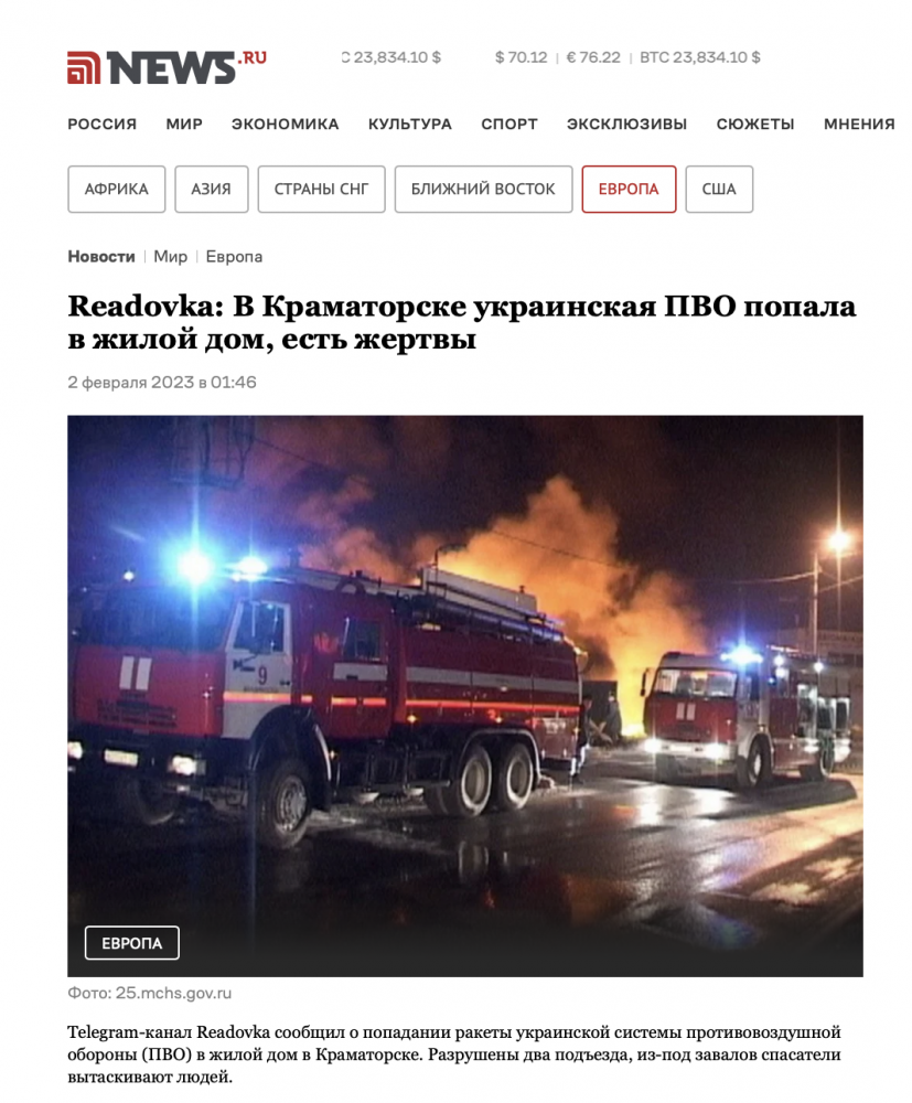 Телеграм-канали з проросійською риторикою та російські ресурси поширюють інформацію, що 1 лютого у будинок в Краматорську влучила українська ракета від системи ППО. Автори додають, що обстріл був організований навмисне, «щоб Зеленському і компанії» було простіше вимагати винищувачів та іншу зброю у Заходу. Але це неправда.