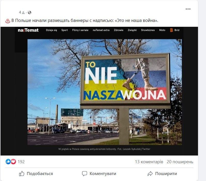 Російські медіа публікують фото рекламного щита із написом, який дослівно перекладається як «Це не наша війна». За словами пропагандистів, таким чином Польща намагається віддалитись від війни в Україні. Це — неправда.