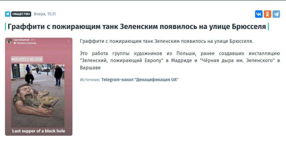Проросійські телеграм-канали та російські медіа публікують фото, яке нібито зроблене в Брюсселі. У тексті під фото додається, що це робота художників з Польщі, які продовжують свою серію графіті. Попередньо, це нібито графіті «Зеленський пожирає Європу» та «Чорна діра імені Зеленського». Але таких робіт не існує.