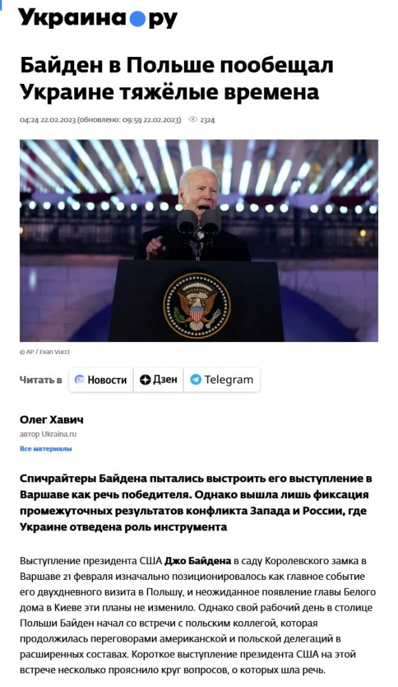Телеграм-канали та російські ресурси поширюють інформацію, що президент Сполучених Штатів Джозеф Байден нібито ообіцяв Україні «важкі часи» під час свого виступу у Польщі. Автори також додають, що спічрайтери президента США намагались зробити його виступ як промову переможця, але вишла лише фіксація проміжних результатів «конфлікту» Заходу та росії, в якому Україні відведено роль інструмента. Це - неправда.