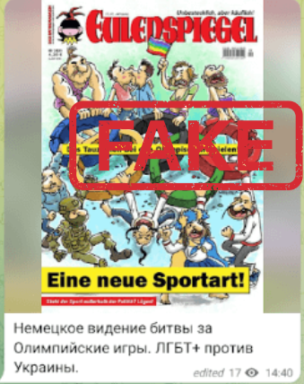 Телеграм-канали поширюють нібито обкладинку німецького журналу «Eulenspiegel», на якій зображено представників ЛГБТ-спільноти та українців, які тримаються за Олімпійські кільця, мовляв, «перетягуємо канат під час Олімпійських ігор». Це — фейк.