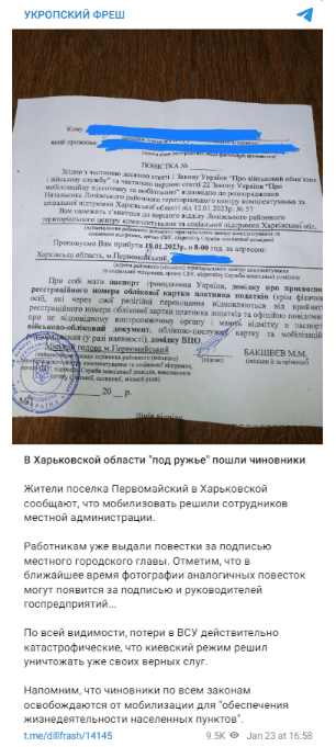 Телеграм-канали з кремлівською риторикою поширюють інформацію, що на ХАрківщинні мобілізують робітників місцевих адміністрацій. У дописах додається фото нібито повістки з підписом міського голови міста Первомайський Миколи Бакшеєва. Зі слів авторів, українські військові несуть "катастрофічні" втрати на фронті, тому доводиться протизаконно мобілізовувати чиновників. Мовляв, незабаром керівники держпідприємств почнуть роздавати повістки. Це — фейк.