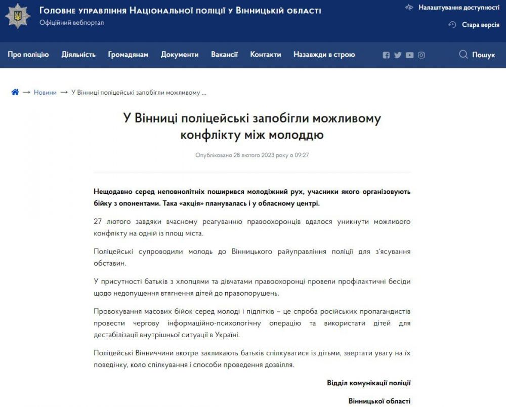 «Нещодавно серед неповнолітніх поширився молодіжний рух, учасники якого організують бійку з опонентами. Така акція планувалась і в обласному центрі», — повідомляють в облуправлінні МВС.