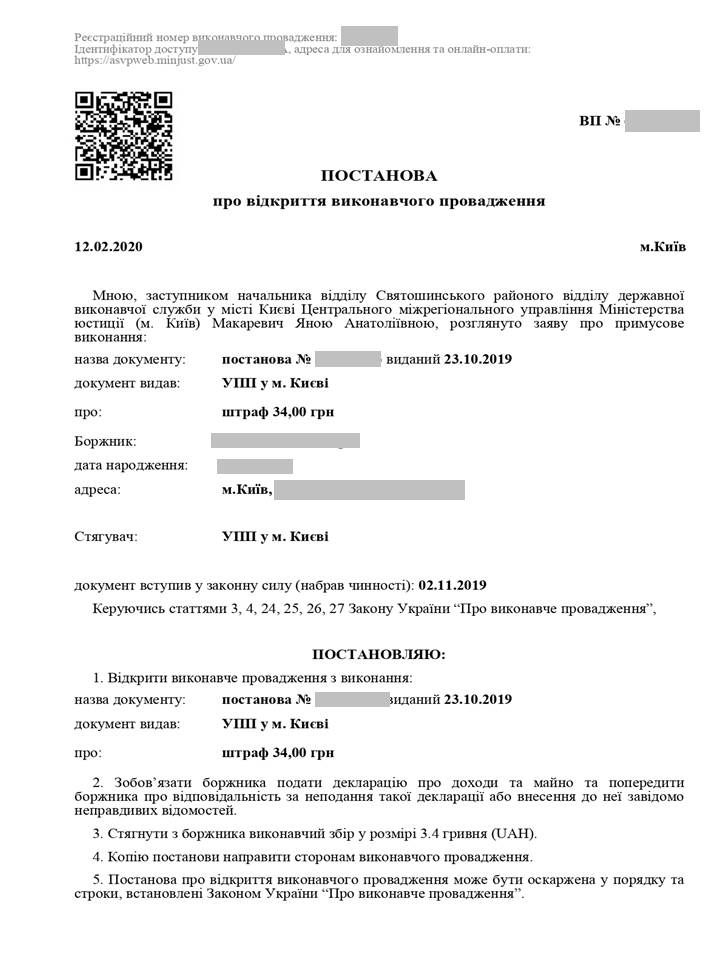 - за адресою в мережі інтернет https://asvpweb.minjust.gov.ua, де також забезпечена можливість онлайн сплати ( за умови що у вас є постанова про відкриття виконавчого провадження) постанова містить ідентифікатор доступу  у правому нижньому куту тексту чи через QR-код який міститься в лівому верхньому кутку постанови.