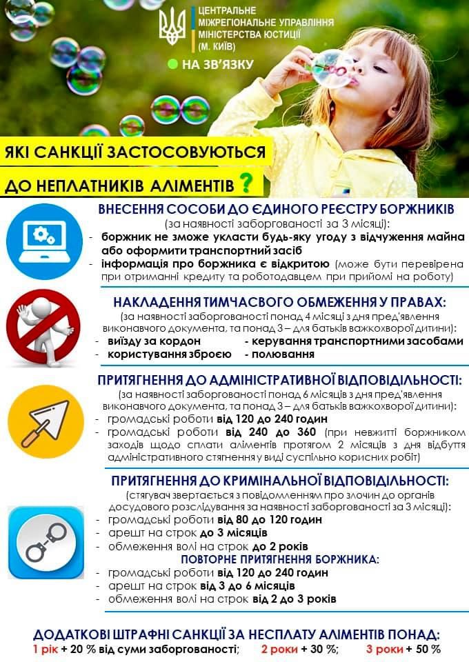 Не слід забувати і про жорсткіші міри, які можуть бути застосовані до несумлінних батьків: адміністративна відповідальність (громадські роботи від 120 до 360 годин); кримінальна відповідальність (громадські роботи від 80 до 120 годин, арешт на строк до трьох місяців, обмеження волі на строк до двох років).