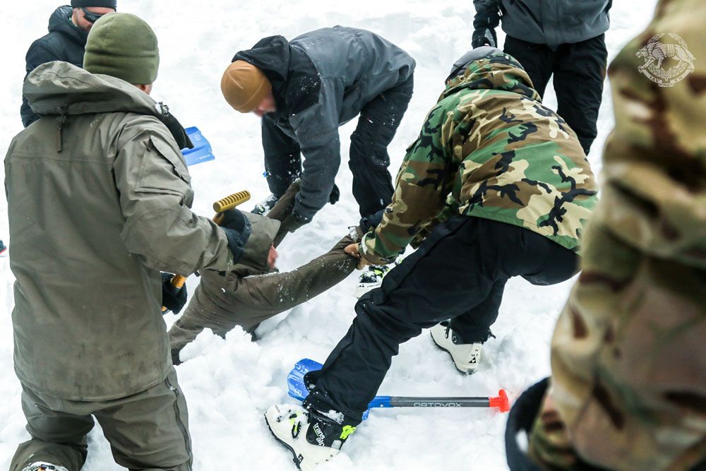 Також влаштовують заняття із пошуку постраждалих у снігових завалах. Принагідно усі проходять стрес-тест: операторів по черзі закопують у сніг, імітуючи наслідки сходження лавини. В руках воїна лишають лавинний щуп, яким він подає умовні сигнали на поверхню. Так лишають на певний час.