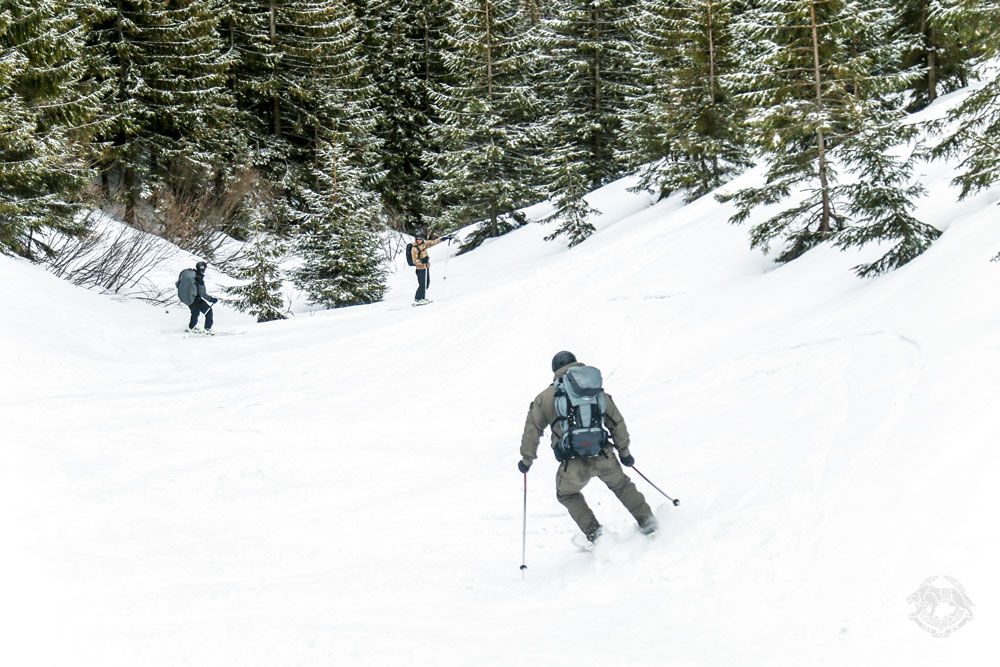 Група відпрацьовує техніку скітуру - пересування на лижах по пересіченій місцевості, на непідготовлених схилах, з постійними підйомами і спусками. Під час таких маневрів дуже важливо правильно розподіляти власні сили. Крім того, під час безперервних навантажень розумієш, наскільки вдало підібрано спорядження та одяг для подорожі. Час від часу на шляху зустрічаються лавинонебезпечні ділянки.
